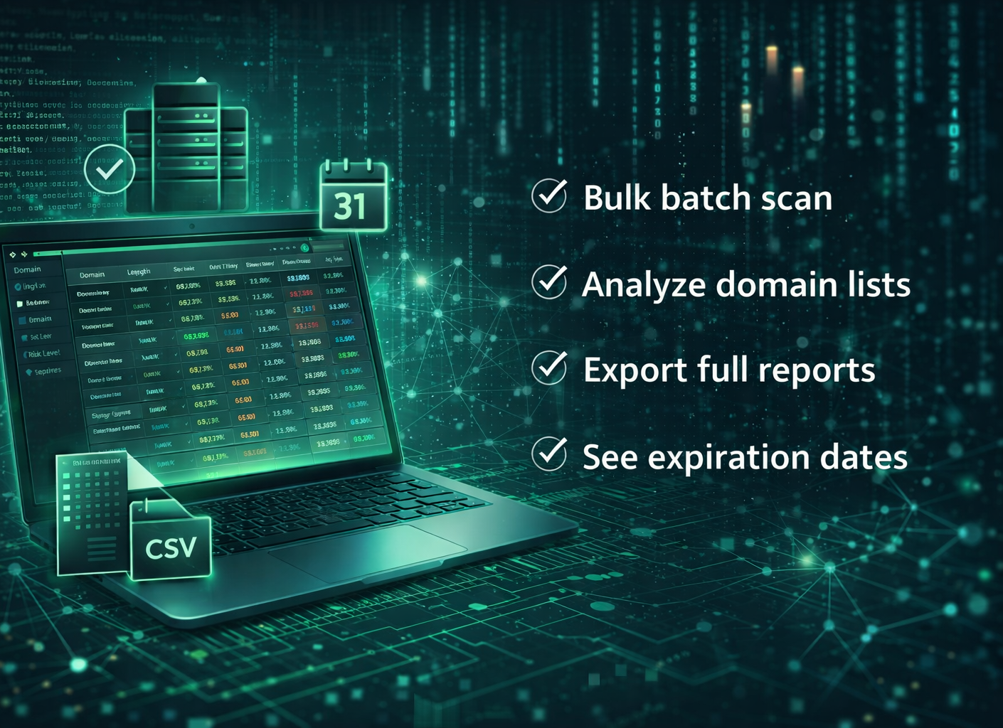 Run bulk batch scans, analyze thousands of domains at once, export detailed reports, and instantly view expiration dates. Built for professionals who need fast, accurate results and full control over large-scale domain analysis.