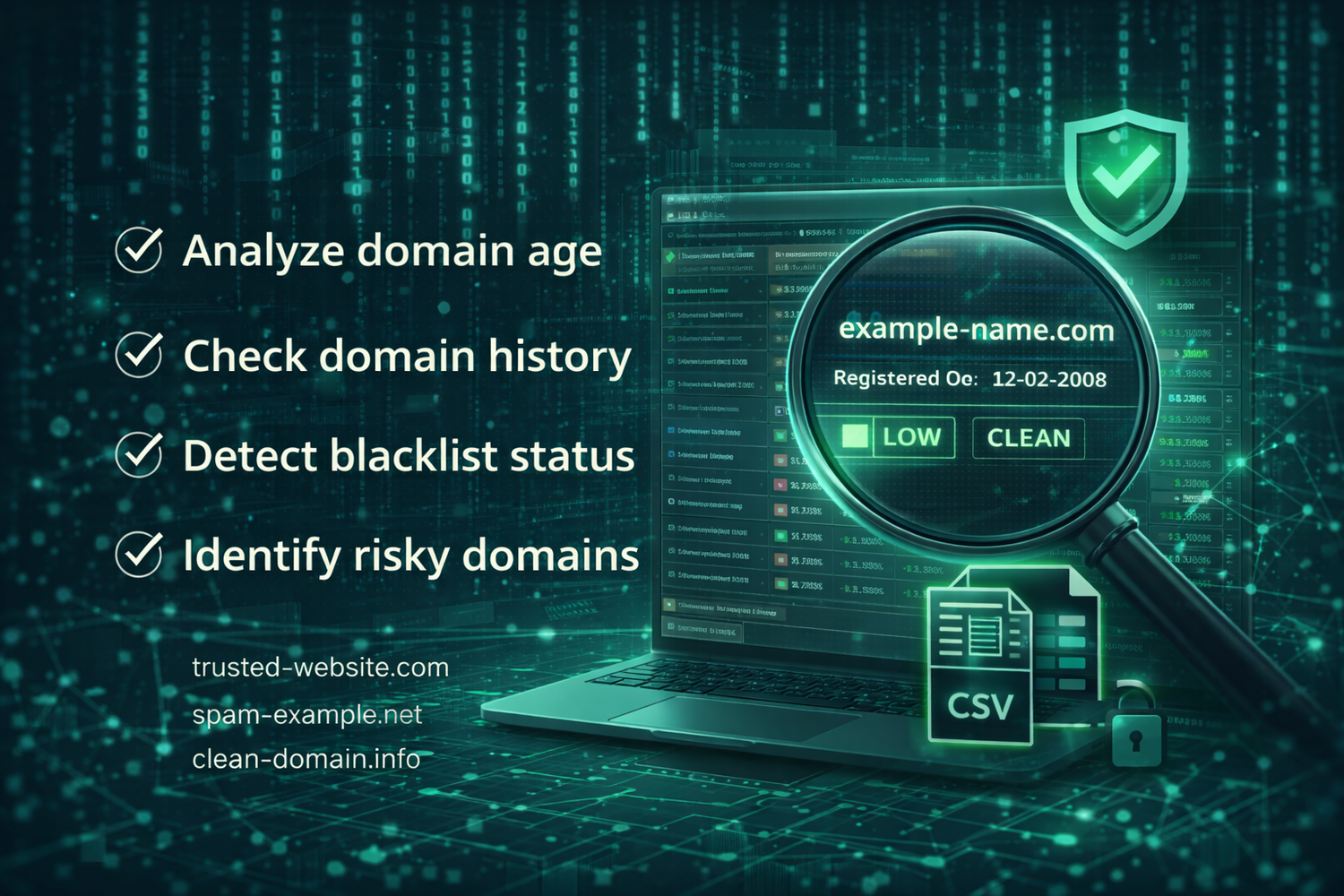 Analyze domain age, review full historical activity, detect blacklist status, and identify risky domains before you buy or use them. Get clear reputation indicators and export results for safer, smarter domain decisions.